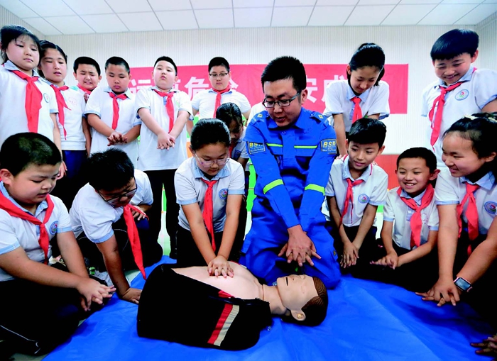 6月23日,山東省青島市即墨區藍天救援隊的志愿者為華山路小學的學生講解心肺復蘇技能 梁孝鵬攝