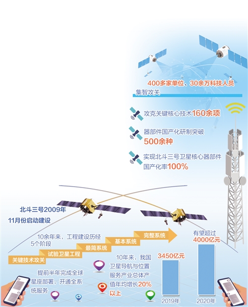 “北斗三號(hào)2009年11月份啟動(dòng)建設(shè)。10余年來(lái),工程建設(shè)歷經(jīng)關(guān)鍵技術(shù)攻關(guān)、試驗(yàn)衛(wèi)星工程、最簡(jiǎn)系統(tǒng)、基本系統(tǒng)、完整系統(tǒng)5個(gè)階段,提前半年完成全球星座部署,開(kāi)通全系統(tǒng)服務(wù)。建成即開(kāi)通、開(kāi)通即服務(wù),工程建設(shè)取得了巨大成就。”冉承其說(shuō)。