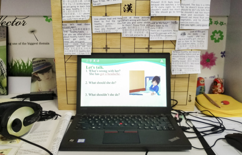 2月17日,北京中關(guān)村第三小學(xué)英語(yǔ)老師魯鳳玲在家中為學(xué)生錄制“國(guó)家中小學(xué)網(wǎng)絡(luò)云平臺(tái)”教學(xué)內(nèi)容,電腦附近貼滿了用來(lái)提詞的紙條