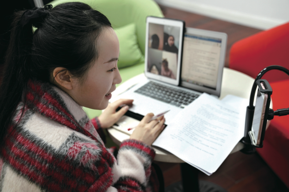 2月25日,上海市盧灣中學六(五)班的班主任陳溦雯與學生們在線互動,圍繞防疫主題開展一堂“云班會” ( 劉穎/攝 )