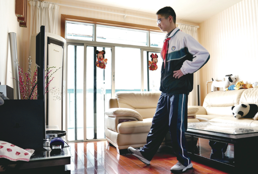 3月2日,上海市三門中學初二學生孫旭涵跟隨在線教育體育課老師學習居家健身操(劉穎 / 攝)