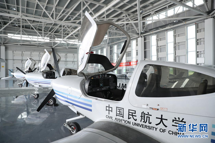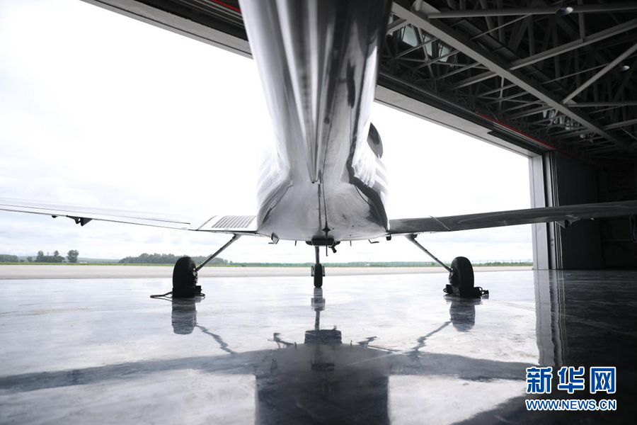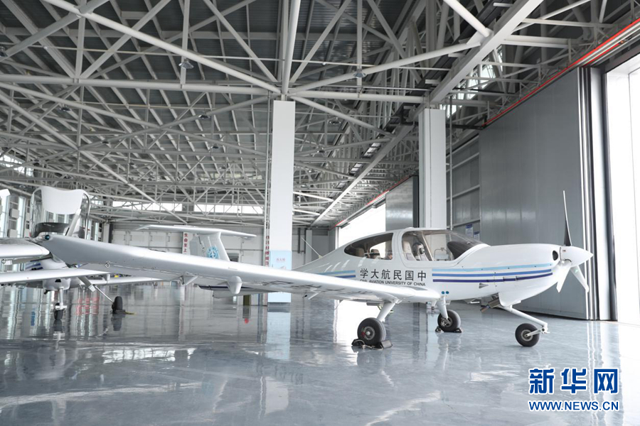 圖為中國(guó)民航大學(xué)內(nèi)蒙古飛行學(xué)院機(jī)庫(kù)中待飛的單發(fā)DA40D飛機(jī)。新華網(wǎng)記者焦鵬 攝