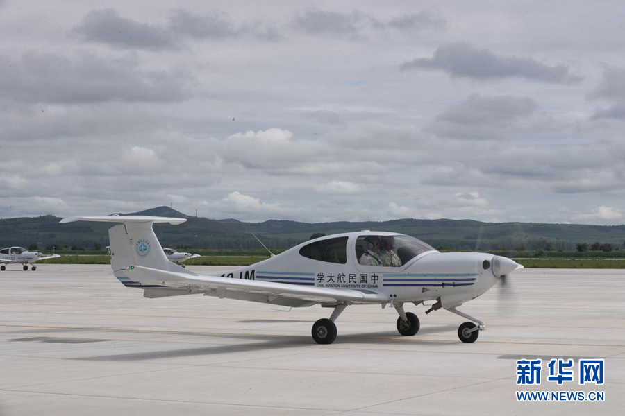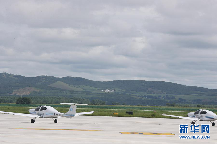 圖為飛行學(xué)員駕駛訓(xùn)練機(jī)從扎蘭屯成吉思汗機(jī)場(chǎng)起飛。新華網(wǎng)記者焦鵬 攝