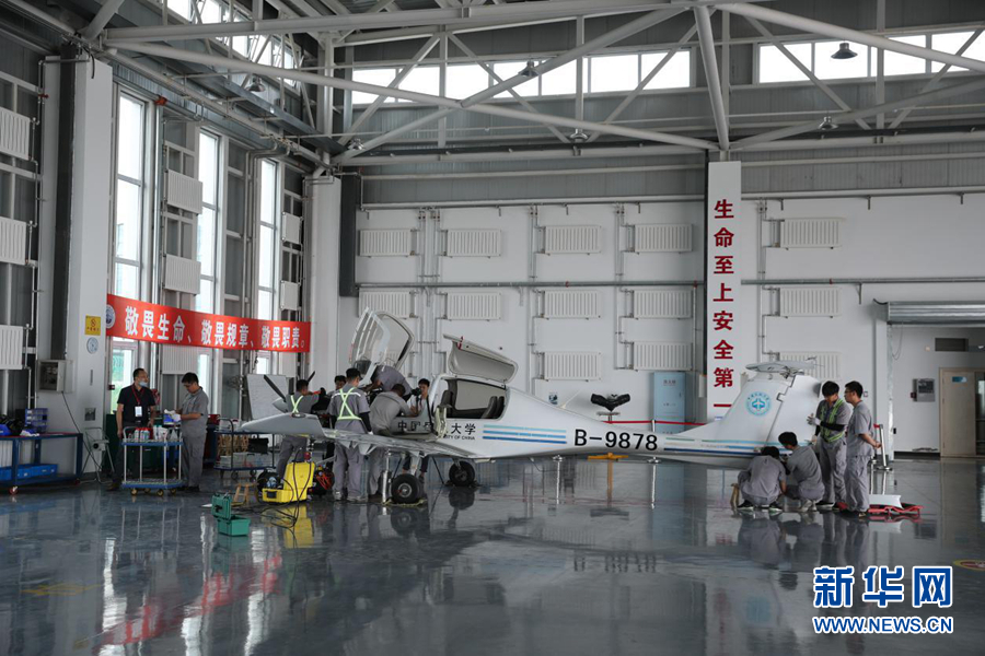 圖為機(jī)務(wù)人員在檢修飛行達(dá)到1000小時(shí)的訓(xùn)練機(jī)。新華網(wǎng)記者焦鵬 攝