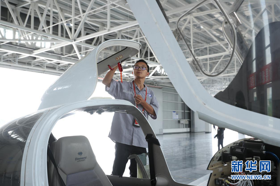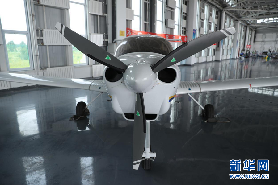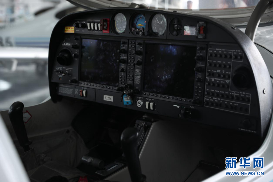 圖為機(jī)庫(kù)中待飛的單發(fā)DA40D飛機(jī)。新華網(wǎng)記者焦鵬 攝