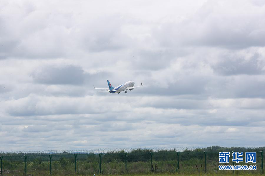 圖為8月6日在扎蘭屯成吉思汗機(jī)場(chǎng)起飛的河北航空公司波音737-800客機(jī)。新華網(wǎng)記者焦鵬 攝