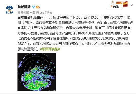據(jù)北京首都國際機(jī)場官方微博消息,目前首都機(jī)場雷雨天氣,預(yù)計(jì)將持續(xù)至14時。截至13時,已執(zhí)行343架次,取消142架次。雷雨天氣將會對首都機(jī)場進(jìn)出港航班造成一定影響,首都機(jī)場建議旅客密切關(guān)注天氣變化和航班信息,合理安排出行計(jì)劃。