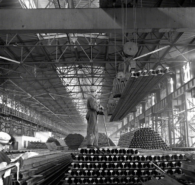 ?“一五”期間,鞍鋼興建的第一座大型軋鋼廠生產(chǎn)能力已迅速超過設計標準。這是這個廠生產(chǎn)的大批鋼軌(攝于1957年4月)。 ?