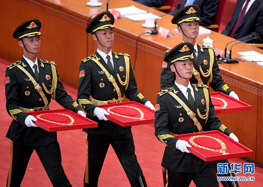 6名號手吹響儀式號角,4名禮兵手捧共和國勛章、國家榮譽稱號獎章正步走上主席臺,鏗鏘的步伐在人民大會堂大禮堂內久久回蕩。中華人民共和國國家勛章和國家榮譽稱號頒授儀式開始了。