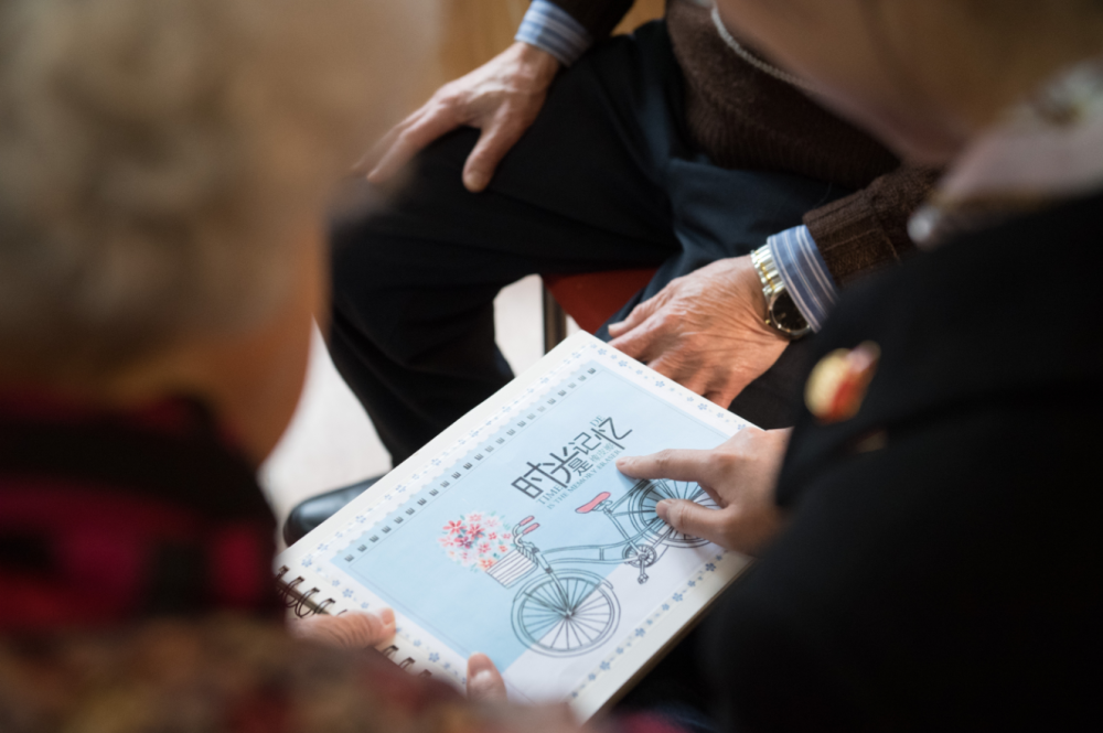 1月17日,杭州市社會(huì)福利中心“90后”朋友張丹俠(右)給83歲的王育華(左)送來她剛剛做好的相冊(cè)(翁忻旸/ 攝)