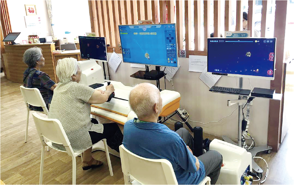 “在它們的陪伴下,康復(fù)就像做游戲,老人們都很喜歡玩。”據(jù)照護(hù)家園負(fù)責(zé)人施君潔介紹,當(dāng)康復(fù)師設(shè)定好康復(fù)方案后,老人坐在電腦前,手肘放在肘托中,手指抓住操縱桿,屏幕上就會出現(xiàn)各種水果。老人可通過操縱桿上下左右移動抓水果,來達(dá)到康復(fù)訓(xùn)練的目的。
