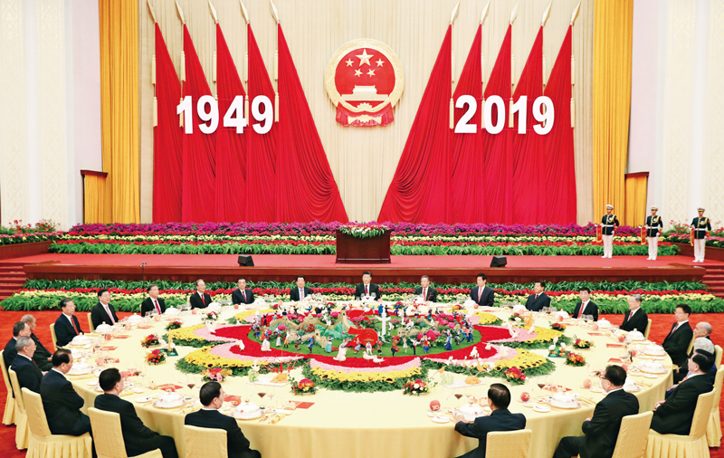 2019年9月30日晚,慶祝中華人民共和國成立70周年招待會在北京人民大會堂隆重舉行。習(xí)近平、李克強、栗戰(zhàn)書、汪洋、王滬寧、趙樂際、韓正、王岐山等黨和國家領(lǐng)導(dǎo)人與4000余名中外人士歡聚一堂,共慶新中國70華誕。 新華社記者 黃敬文/攝