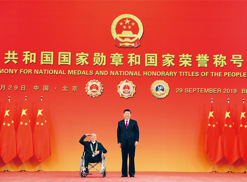 2019年9月29日,中華人民共和國國家勛章和國家榮譽稱號頒授儀式在北京人民大會堂金色大廳隆重舉行。中共中央總書記、國家主席、中央軍委主席習(xí)近平向“共和國勛章”獲得者張富清頒授勛章。 新華社記者 王曄/攝