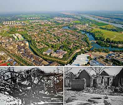 拼版照片:上圖為8月17日無人機航拍臺兒莊古城全貌(新華社記者郭緒雷攝);下兩圖為1938年臺兒莊大戰后古城廢墟(資料照片)。