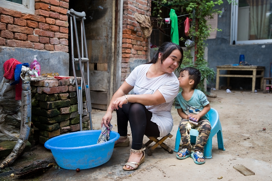 在呂陵鎮還有這么一個村民,黃菲菲,患有小兒麻痹,家有老人需要贍養,還有個2歲多的孩子,丈夫也常年不在家。雖然她是貧困戶,生活負擔這么大,但磨難壓不倒堅強的她。為了讓孩子以后能生活地更好些,她來到扶貧車間打工。(楊科 攝)