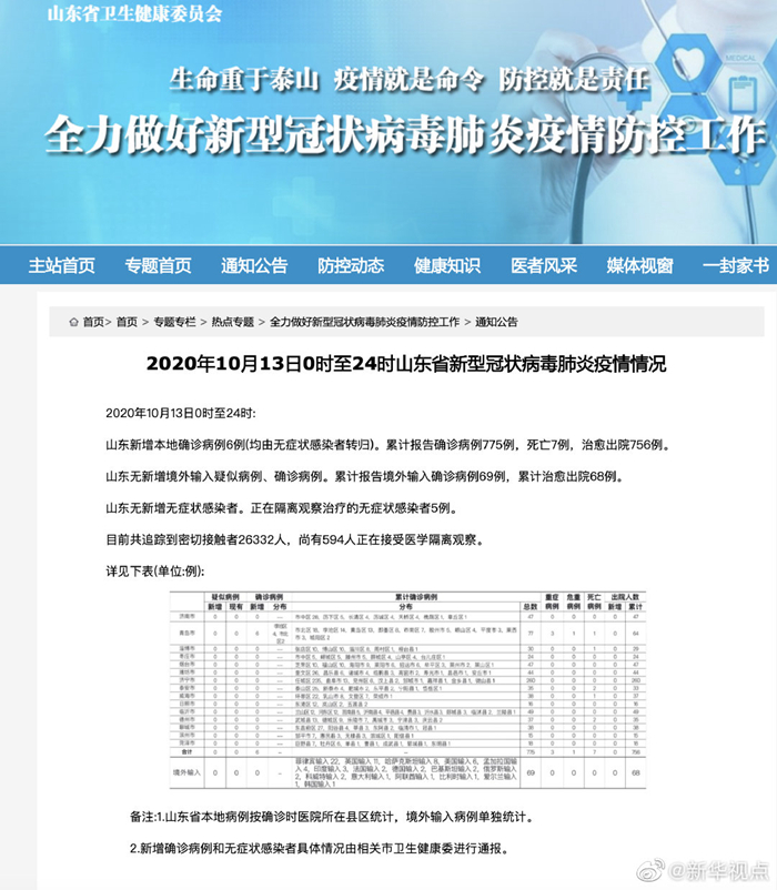 2020年10月13日0時至24時:山東新增本地確診病例6例(均由無癥狀感染者轉(zhuǎn)歸)。累計報告確診病例775例,死亡7例,治愈出院756例。