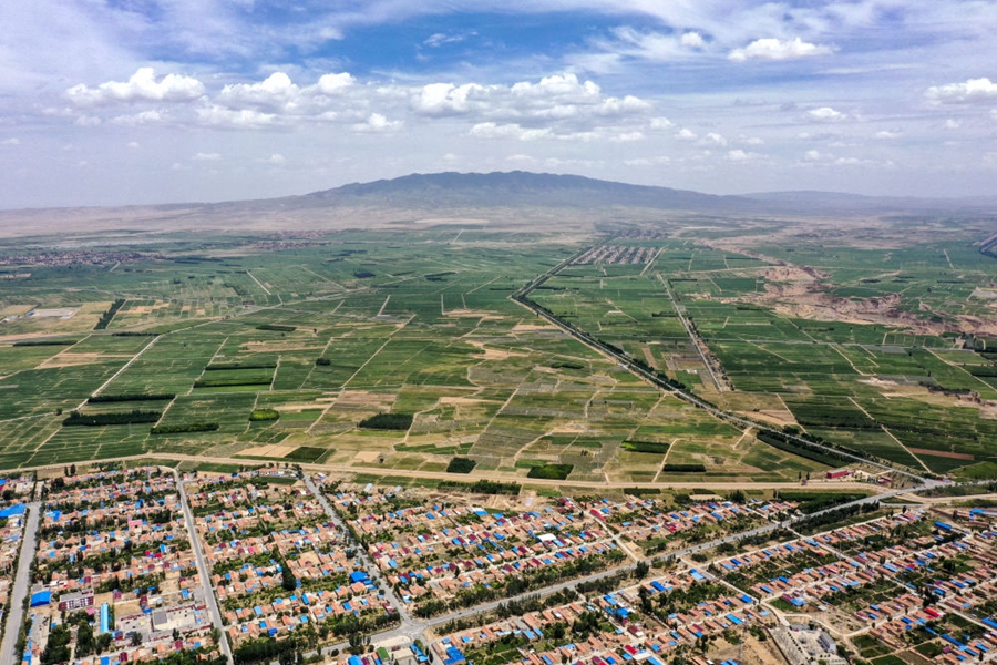 這是6月23日拍攝的位于羅山腳下的寧夏吳忠市紅寺堡區一角(無人機照片)。新華社記者 馮開華 攝