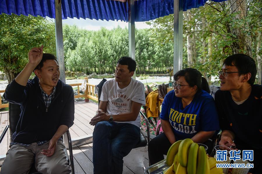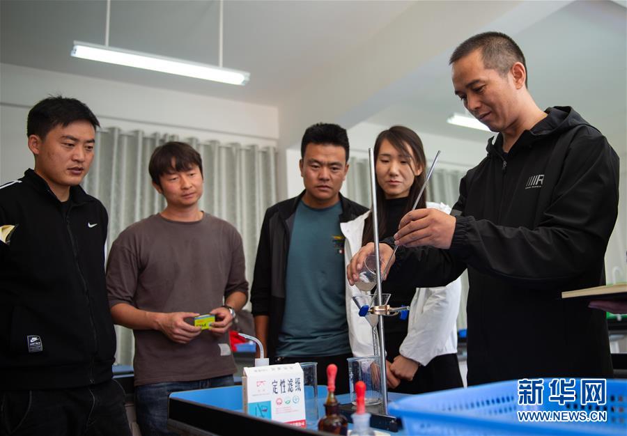 北京市援青支教教師、來自通州區陸辛莊學校的化學教師祁生貴(右一)在青海省玉樹州第四民族高級中學指導學校教師進行實驗教學(8月12日攝)。新華社記者 陳鐘昊 攝