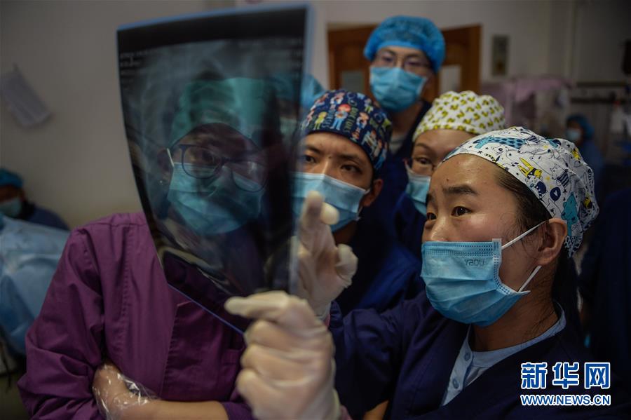 在西藏拉薩市人民醫院內,首都兒科研究所的援藏醫生韓同英(右一)進行教學查房時,與徒弟們一起研究入院新生兒胸片(8月3日攝)。新華社記者 彭子洋 攝