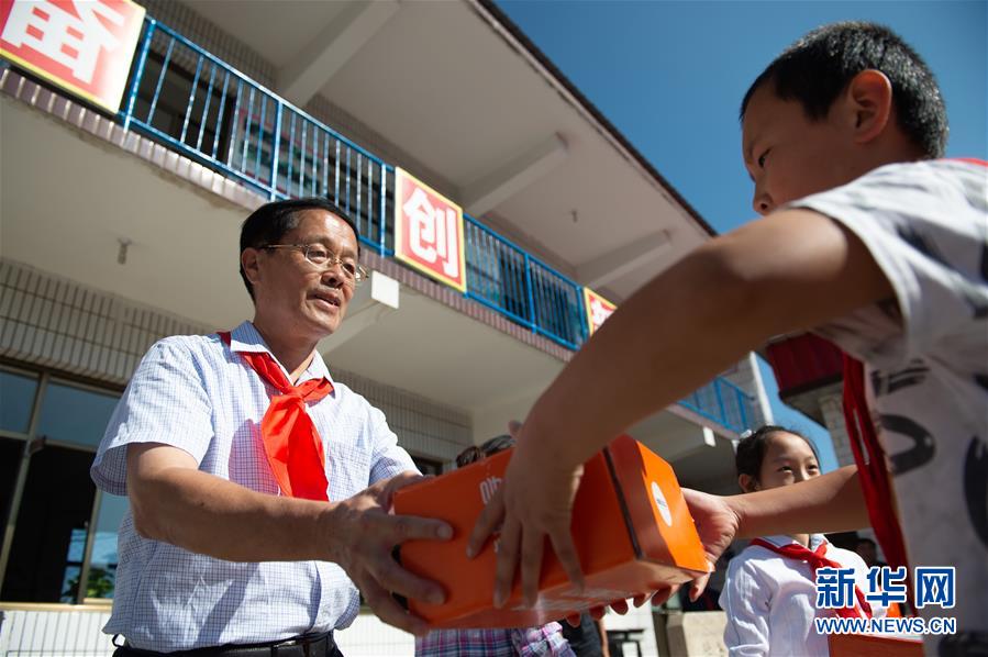 北京市西城區陶然亭小學退休老校長劉建文(左)在他支教的河北省阜平縣半溝小學開學典禮上給學生贈送學習用品(9月3日攝)。新華社記者 陳鐘昊 攝