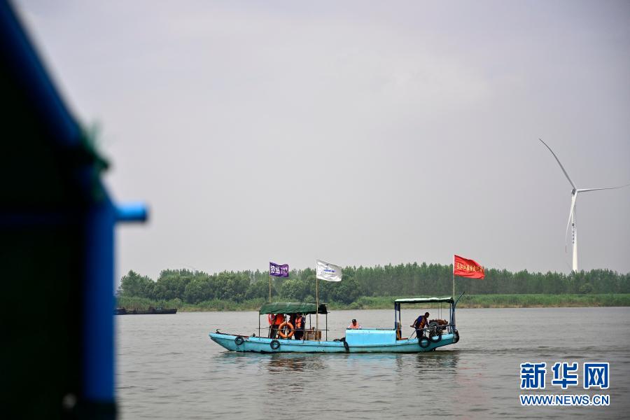 在江西省湖口縣,江豚協助巡護隊的隊員在鄱陽湖水域巡查(6月8日攝)。新華社記者 彭昭之 攝