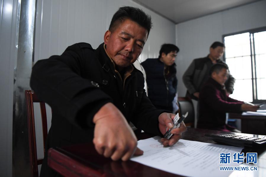 在湖南常德漢壽縣蔣家嘴鎮,一名過去在洞庭湖捕魚的漁民在漢壽縣捕撈漁民退捕協議書上按下手印(2019年12月17日攝)。新華社記者 薛宇舸 攝