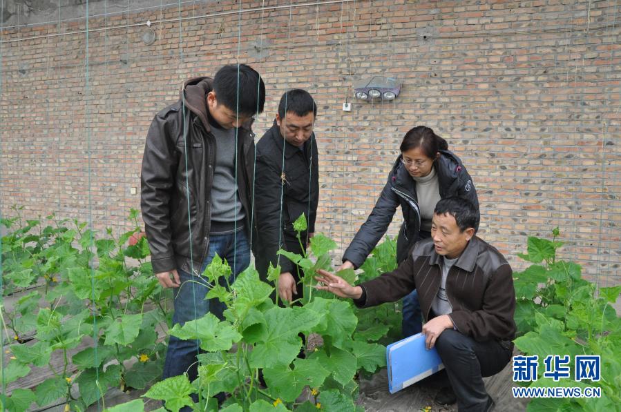 李加旺(右一)與課題組成員一起觀察黃瓜植株的生長情況(2014年11月27日攝)。新華社發(天津科潤黃瓜研究所供圖)