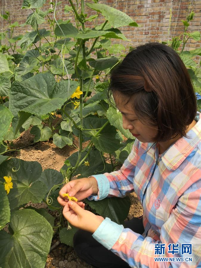 李愚鶴在田間進行人工授粉(2019年6月27日攝)。新華社發(天津科潤黃瓜研究所供圖)