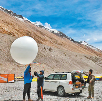西藏自治區氣象局2020珠峰高程測量氣象探測保障服務隊施放高空氣象探測氣球。自然資源部供圖