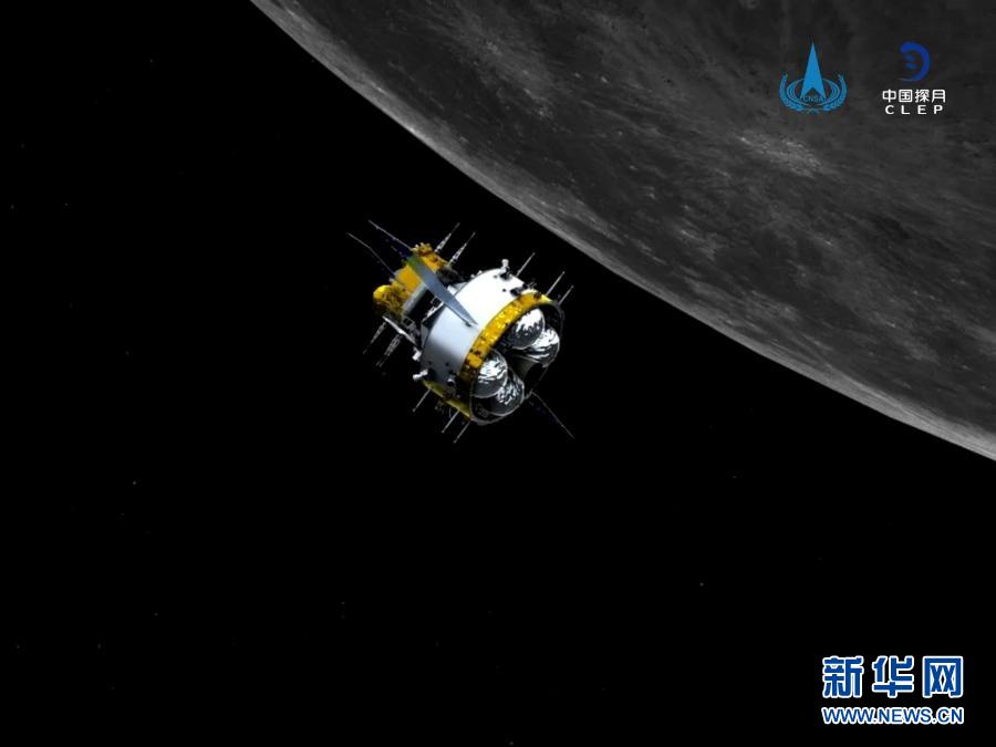 軌返組合體與上升器分離前模擬圖。記者從國家航天局獲悉,北京時間12月6日12時35分,嫦娥五號軌道器返回器組合體與上升器成功分離,進入環(huán)月等待階段,準備擇機返回地球。新華社發(fā)(國家航天局供圖)
