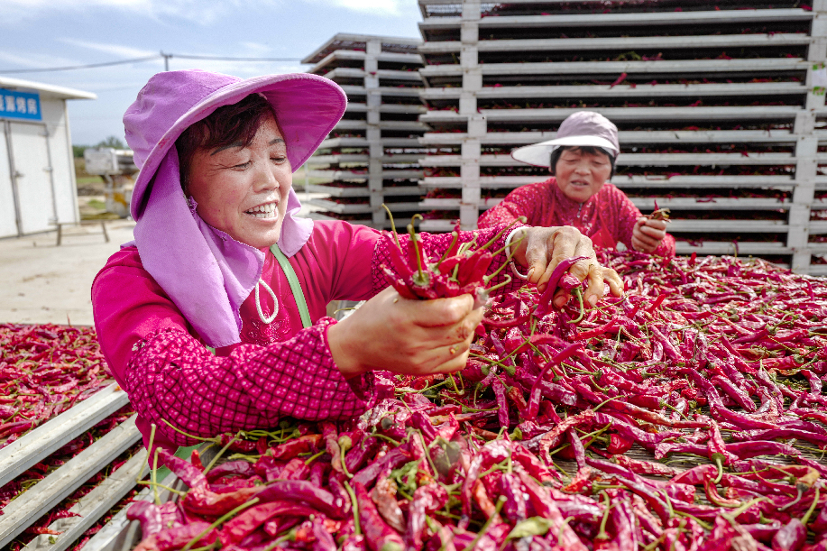 ????2018年拍攝于陜西興平桑鎮(zhèn)西橋村金鵬辣蒜專業(yè)合作社,農民分揀辣椒,辣椒品質優(yōu)良,農民喜上眉梢。(組照2)張綺云 攝