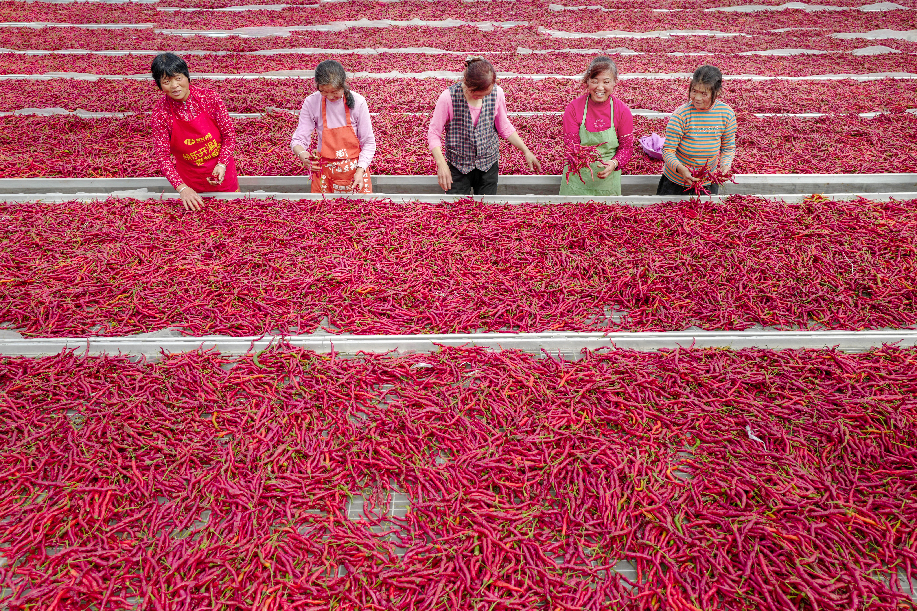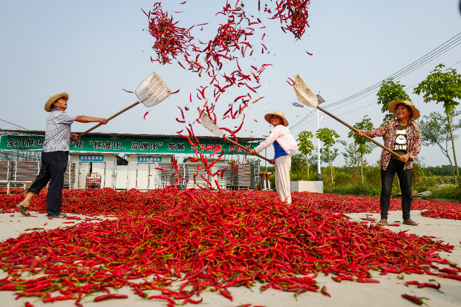 ??????2020年拍攝于陜西興平桑鎮(zhèn)西橋村金鵬辣蒜專業(yè)合作社,農民將辣椒揚起晾曬。(組照4)張綺云 攝