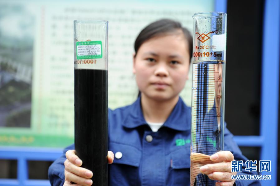 貴州省仁懷市茅臺酒廠污水處理廠的工人展示污水處理前后的水質對比效果(2018年10月23日攝)。新華社記者 楊文斌 攝