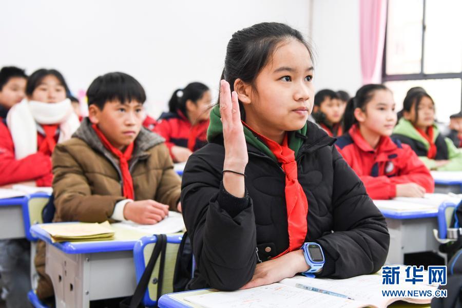廣西羅城·深圳實驗小學六年級學生潘欣怡(前)在課堂上舉手回答問題(12月16日攝)。新華社記者 曹祎銘 攝