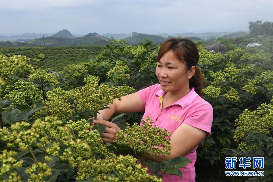 廣西羅城仫佬族自治縣小長安鎮民族村村委會主任覃鳳瓊在查看吳茱萸長勢(6月21日攝)。新華社發(韋如代 攝)