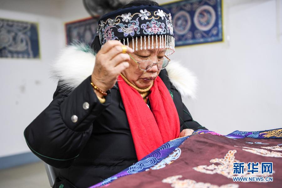 63歲的自治區級仫佬族刺繡代表性傳承人謝秀榮在工作室中創作(12月16日攝)。新華社記者 曹祎銘 攝