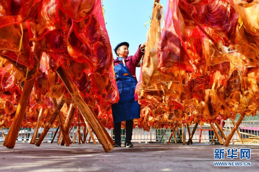 在江西省興國縣楓邊鄉密石村,一名村民在制作臘鴨(12月21日攝)。新華社發(陳鵬 攝)