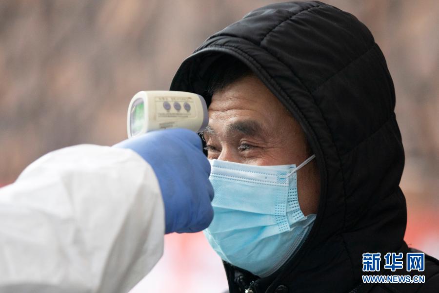 1月15日,志愿者在望奎縣華騰園小區內為居民測量體溫。 新華社發(張濤 攝)