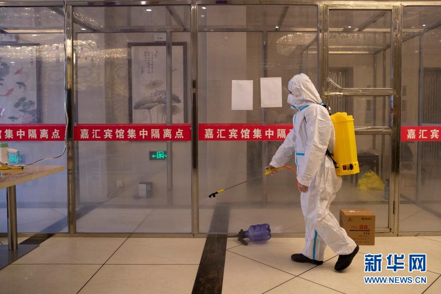 1月15日,隔離點醫護人員在望奎縣嘉匯酒店集中隔離點進行消殺作業。 新華社發(張濤 攝)