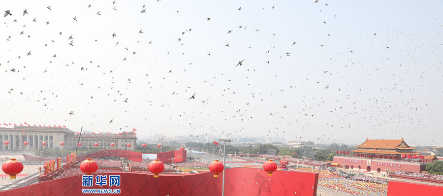 10月1日上午,慶祝中華人民共和國成立70周年大會在北京天安門廣場隆重舉行。這是天安門廣場上放飛和平鴿。 新華社記者 金立旺 攝