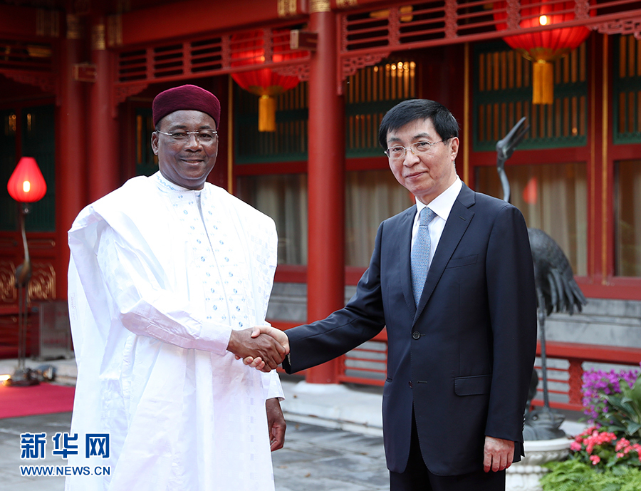 8月31日,中共中央政治局常委、中央書記處書記王滬寧在北京釣魚臺國賓館會見尼日爾總統伊素福。 新華社記者丁海濤攝