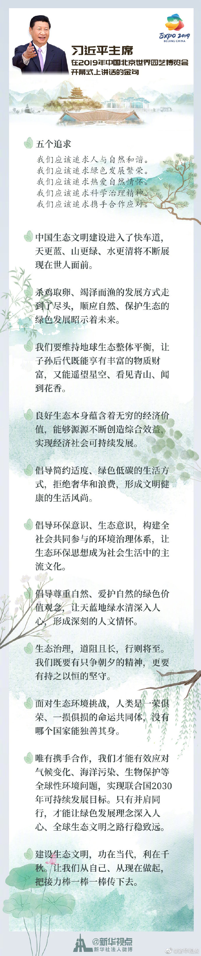 習(xí)近平主席28日出席2019年中國(guó)北京世界園藝博覽會(huì)開(kāi)幕式并發(fā)表講話,傳遞的綠色發(fā)展理念直抵人心。詳情請(qǐng)戳圖看金句↓ ????