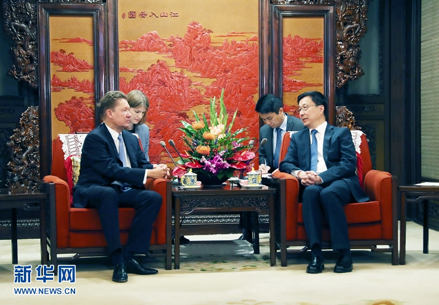 9月3日,中共中央政治局常委、國務(wù)院副總理韓正在北京中南海紫光閣會見俄羅斯天然氣工業(yè)公司總裁米勒。新華社記者姚大偉攝