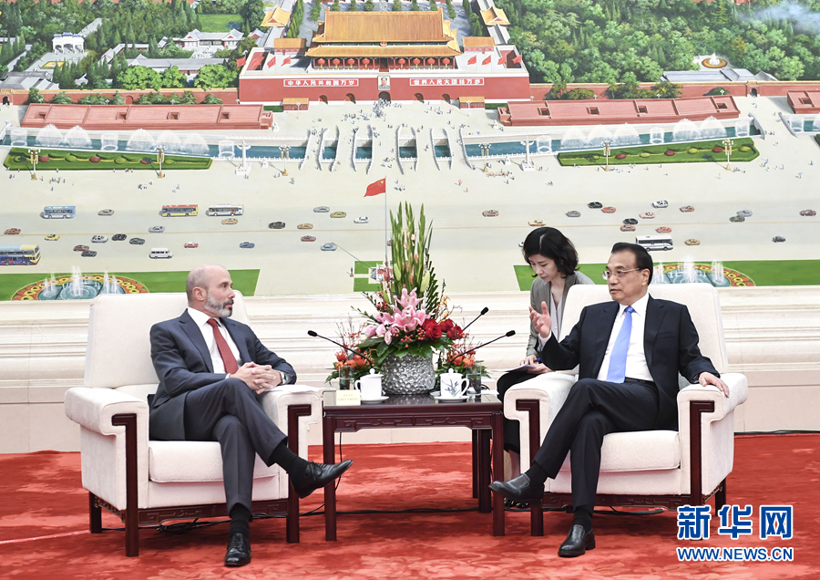 10月17日,國(guó)務(wù)院總理李克強(qiáng)在北京人民大會(huì)堂會(huì)見(jiàn)美中貿(mào)易全國(guó)委員會(huì)董事會(huì)主席格林伯格率領(lǐng)的訪華代表團(tuán)并同他們座談交流。新華社記者 殷博古 攝