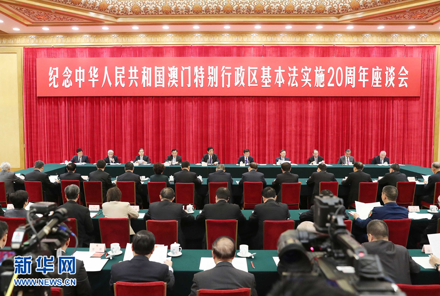 為了紀念澳門基本法實施20周年,今天,我們相聚在首都北京人民大會堂,隆重舉行座談會,緬懷鄧小平同志等老一輩黨和國家領導人開創的“一國兩制”歷史功績,學習貫徹習近平總書記關于“一國兩制”的重要論述,總結澳門基本法實施20年來的成功經驗,堅定踐行“一國兩制”偉大事業的決心和信心,具有重要意義。