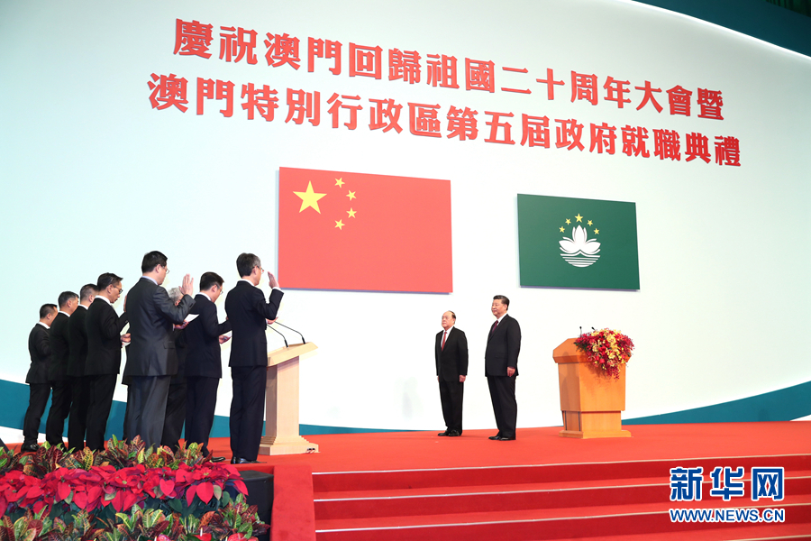 12月20日,慶祝澳門回歸祖國20周年大會暨澳門特別行政區(qū)第五屆政府就職典禮在澳門東亞運動會體育館隆重舉行。中共中央總書記、國家主席、中央軍委主席習近平出席并發(fā)表重要講話。由習近平監(jiān)誓,澳門特別行政區(qū)第五屆政府主要官員在澳門特區(qū)第五任行政長官賀一誠帶領下宣誓就職。 新華社記者 鞠鵬 攝
