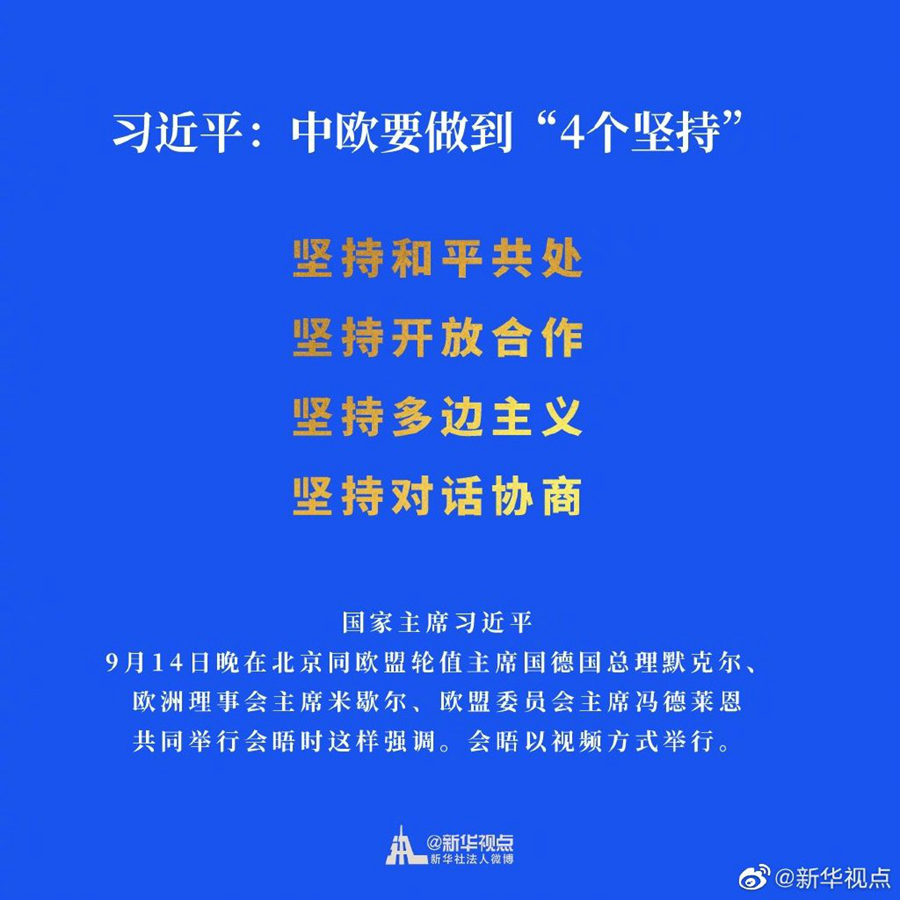 國家主席習近平9月14日晚在北京同歐盟輪值主席國德國總理默克爾、歐洲理事會主席米歇爾、歐盟委員會主席馮德萊恩共同舉行會晤,會晤以視頻方式舉行。