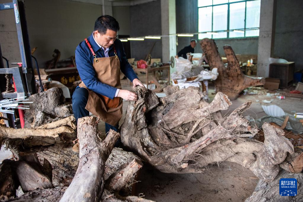 5月23日,在洞口县岩山镇阳家山村,洞口木雕非遗传承人傅立先在挑选木雕材料。