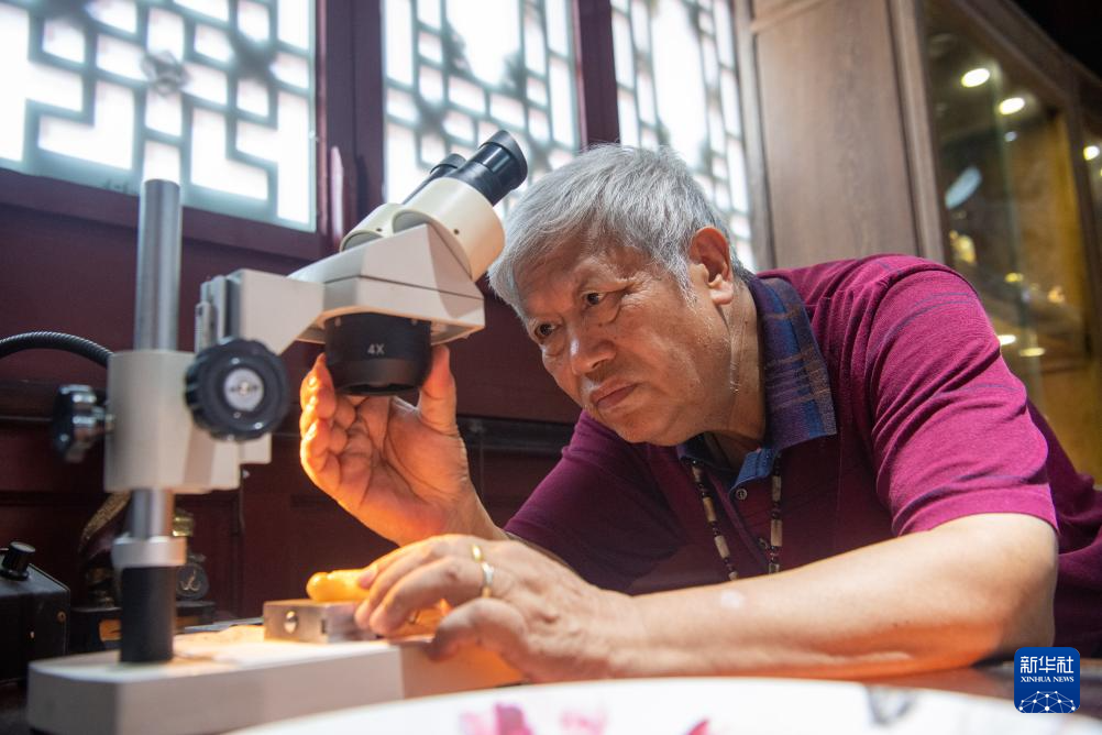 7月31日,潘启慧在通过显微镜观察微刻作品《清明上河图》。这件作品是在长5.29厘米、宽0.24厘米的动物骨头上仿刻《清明上河图》。
