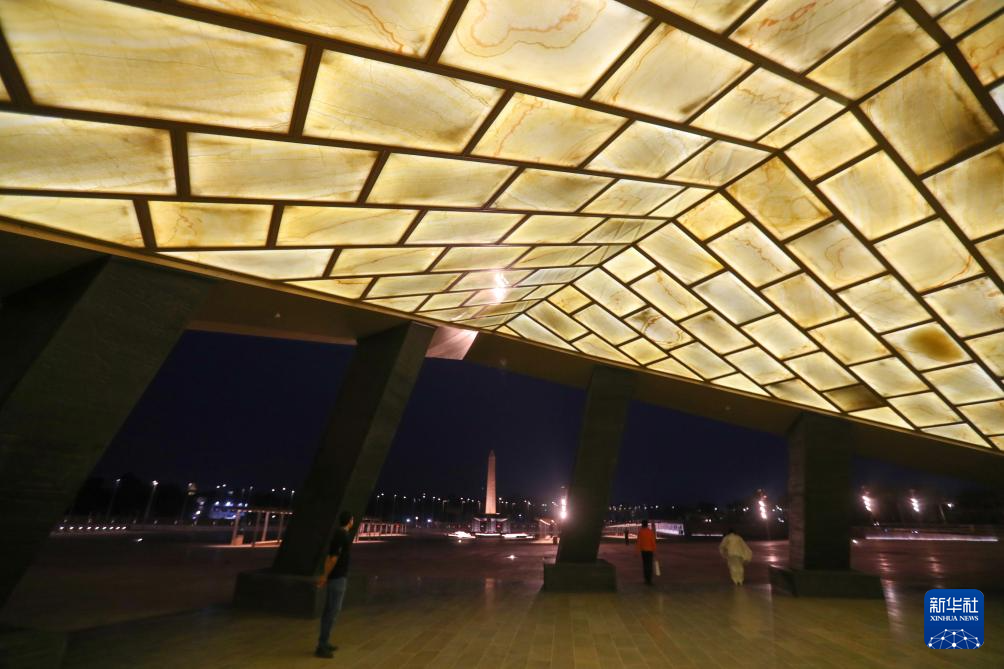 这是10月8日在埃及吉萨省拍摄的晚上亮灯的大埃及博物馆一处入口。